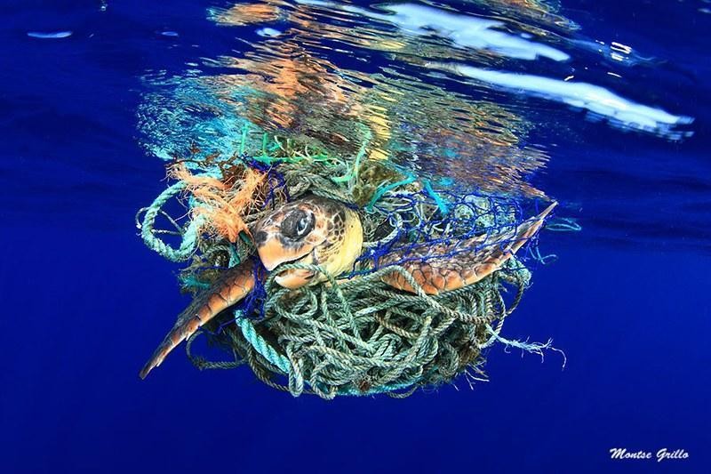 Loggerhead sea turtle (Caretta caretta) entangled in a dense mass of discarded fishing nets and ropes. Photograph by Montse Grillo