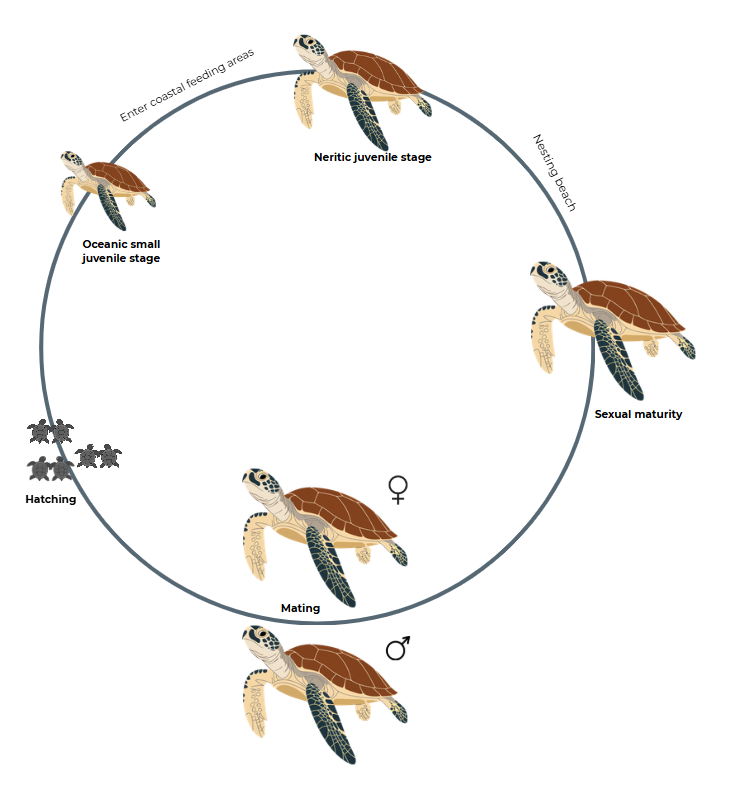 In the North Atlantic, hatchlings emerge from beaches primarily in Florida (Brost et al., 2015) and Cape Verde (Martins et al., 2022), with additional contributions from Mexico (González et al., 2020). Carried by ocean currents, they travel to developmental zones such as the Azores, Madeira, or the Canary Islands (Monzón-Argüello et al., 2009; Tortosa García de Ceca, 2021).  The early juvenile oceanic (pelagic) phase can last several years, in some cases over a decade (Bjorndal et al., 2000) and is often associated with Sargassum mats and open‑ocean currents (Witherington et al., 2012). As they grow larger, juveniles gradually undergo an ontogenetic habitat shift into neritic (coastal) waters, where they feed on benthic prey. Adults continue to use neritic habitats for foraging and undertake seasonal migrations to their natal beaches to reproduce, a process commonly known as natal homing (McClellan & Read, 2007; Ministerio para la Transición Ecológica y el Reto Demográfico, 2022).